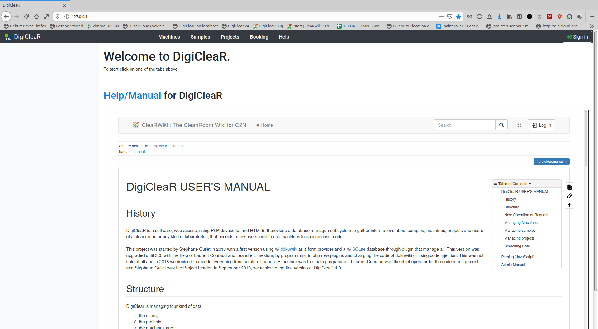 This project was started by Stephane Guilet in 2013 with a first version using dokuwiki as a form provider and a SQLite database through plugin that manage all. This version was upgraded until 3.0, with the help of Laurent Couraud and Léandre Elmestour, by programming in php new plugins and changing the code of dokuwiki or using code injection. This was not safe at all and in 2018 we decided to recode everything from scratch. Léandre Elmestour was the main programmer, Laurent Couraud was the chief operator for the code management and Stéphane Guilet was the Project Leader. In September 2019, we achieved the first version of DigiCleaR 4.0