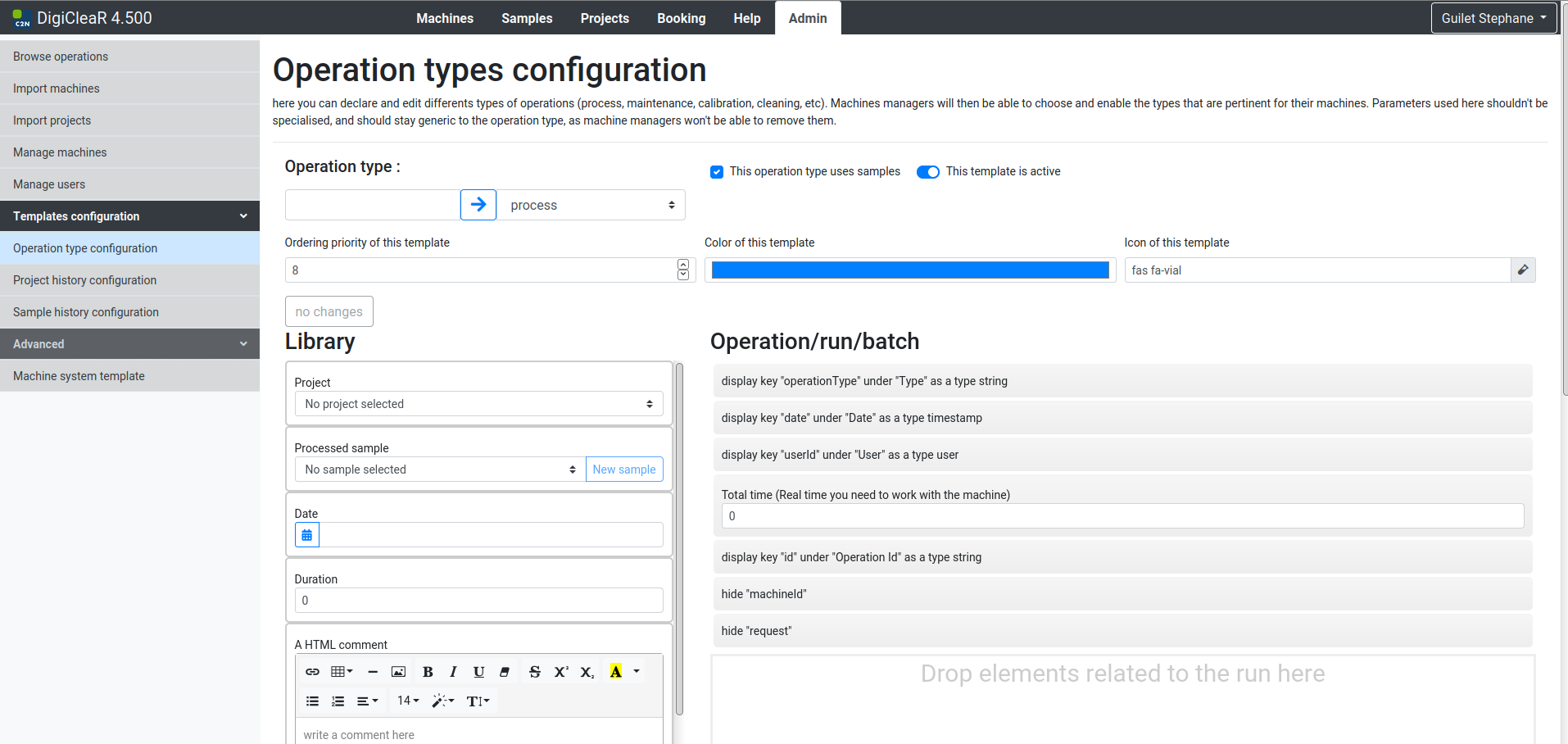 With this section, you can create the different type of templates that manager of machines can choose to configure. For each type of template you can put some mandatory components in the template to get some common data with all the operation, whatever is the type of data.